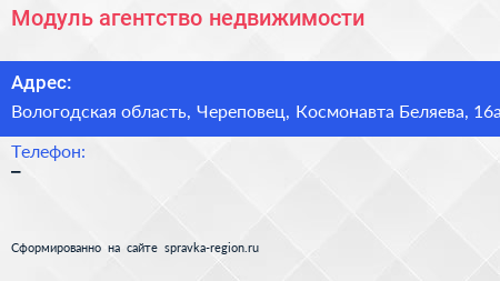 Модуль, агентство недвижимости по адресу Вологодская область, Череповец, Космонавта Беляева, 16а в дальнейшем Организация, размещена в следующих категориях: