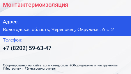 Монтажтермоизоляция по адресу Вологодская область, Череповец, Окружная, 6 ст2 в дальнейшем Организация, размещена в следующих категориях: