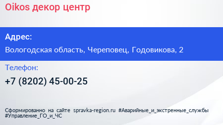 Oikos, декор-центр по адресу Вологодская область, Череповец, Годовикова, 2 в дальнейшем Организация, размещена в следующих категориях: