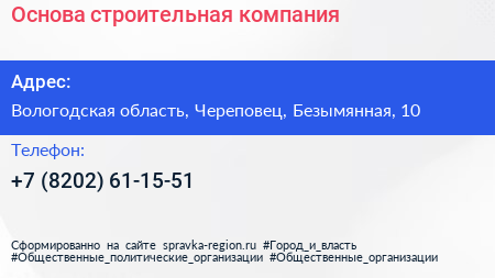 Основа, строительная компания по адресу Вологодская область, Череповец, Безымянная, 10 в дальнейшем Организация, размещена в следующих категориях: