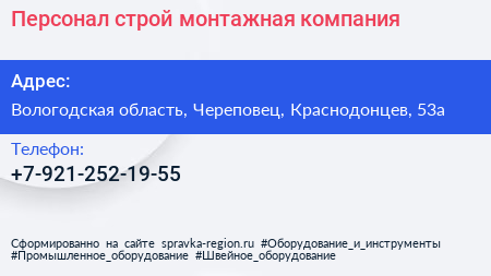 Персонал строй, монтажная компания по адресу Вологодская область, Череповец, Краснодонцев, 53а в дальнейшем Организация, размещена в следующих категориях: