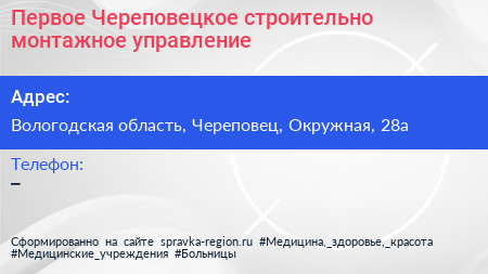 Первое Череповецкое строительно-монтажное управление по адресу Вологодская область, Череповец, Окружная, 28а в дальнейшем Организация, размещена в следующих категориях: