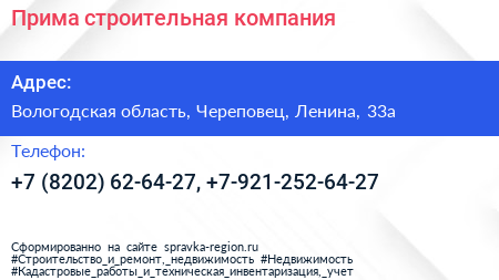 Прима, строительная компания по адресу Вологодская область, Череповец, Ленина, 33а в дальнейшем Организация, размещена в следующих категориях: