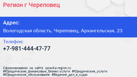 Регион, г. Череповец по адресу Вологодская область, Череповец, Архангельская, 23 в дальнейшем Организация, размещена в следующих категориях: