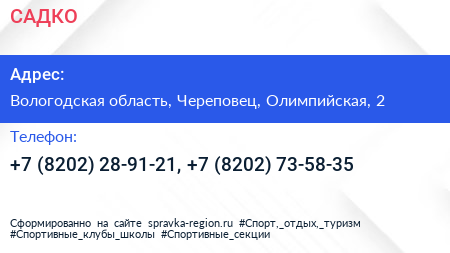 САДКО по адресу Вологодская область, Череповец, Олимпийская, 2 в дальнейшем Организация, размещена в следующих категориях: