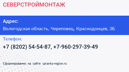 СЕВЕРСТРОЙМОНТАЖ по адресу Вологодская область, Череповец, Краснодонцев, 3Б в дальнейшем Организация, размещена в следующих категориях:
