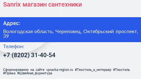 Sanrix, магазин сантехники по адресу Вологодская область, Череповец, Октябрьский проспект, 39 в дальнейшем Организация, размещена в следующих категориях: