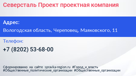 Северсталь-Проект, проектная компания по адресу Вологодская область, Череповец, Маяковского, 11 в дальнейшем Организация, размещена в следующих категориях: