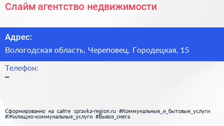 Слайм, агентство недвижимости по адресу Вологодская область, Череповец, Городецкая, 15 в дальнейшем Организация, размещена в следующих категориях: