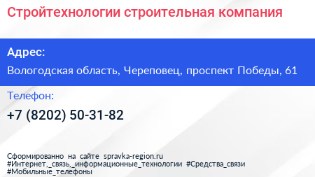 Стройтехнологии, строительная компания по адресу Вологодская область, Череповец, проспект Победы, 61 в дальнейшем Организация, размещена в следующих категориях: