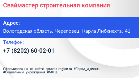 Сваймастер, строительная компания по адресу Вологодская область, Череповец, Карла Либкнехта, 41 в дальнейшем Организация, размещена в следующих категориях: