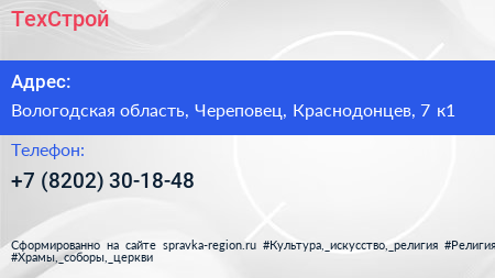 ТехСтрой по адресу Вологодская область, Череповец, Краснодонцев, 7 к1 в дальнейшем Организация, размещена в следующих категориях: