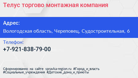 Телус, торгово-монтажная компания по адресу Вологодская область, Череповец, Судостроительная, 6 в дальнейшем Организация, размещена в следующих категориях: