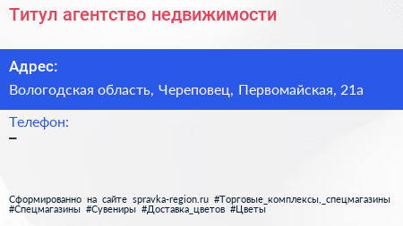 Титул, агентство недвижимости по адресу Вологодская область, Череповец, Первомайская, 21а в дальнейшем Организация, размещена в следующих категориях: