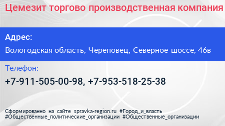 Цемезит, торгово-производственная компания по адресу Вологодская область, Череповец, Северное шоссе, 46в в дальнейшем Организация, размещена в следующих категориях: