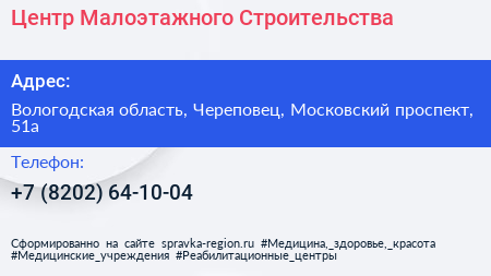 Центр Малоэтажного Строительства+ по адресу Вологодская область, Череповец, Московский проспект, 51а в дальнейшем Организация, размещена в следующих категориях: