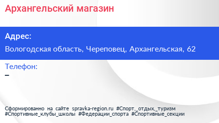 Архангельский, магазин по адресу Вологодская область, Череповец, Архангельская, 62 в дальнейшем Организация, размещена в следующих категориях: