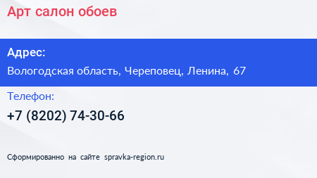 Арт, салон обоев по адресу Вологодская область, Череповец, Ленина, 67 в дальнейшем Организация, размещена в следующих категориях: