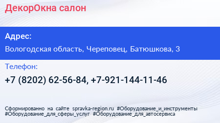 ДекорОкна, салон по адресу Вологодская область, Череповец, Батюшкова, 3 в дальнейшем Организация, размещена в следующих категориях: