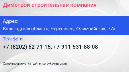 Димстрой, строительная компания по адресу Вологодская область, Череповец, Олимпийская, 77а в дальнейшем Организация, размещена в следующих категориях: