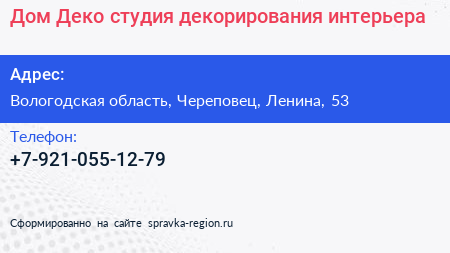 Дом Деко, студия декорирования интерьера по адресу Вологодская область, Череповец, Ленина, 53 в дальнейшем Организация, размещена в следующих категориях: