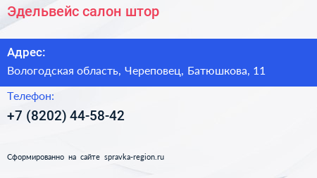 Эдельвейс, салон штор по адресу Вологодская область, Череповец, Батюшкова, 11 в дальнейшем Организация, размещена в следующих категориях: