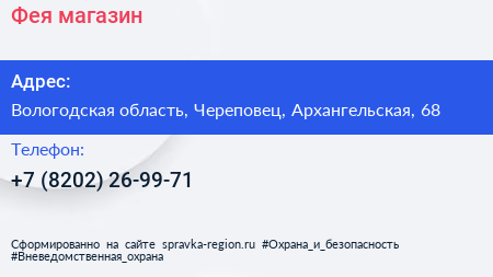 Фея, магазин по адресу Вологодская область, Череповец, Архангельская, 68 в дальнейшем Организация, размещена в следующих категориях: