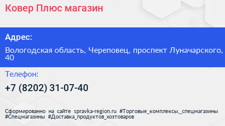 Ковер Плюс, магазин по адресу Вологодская область, Череповец, проспект Луначарского, 40 в дальнейшем Организация, размещена в следующих категориях: