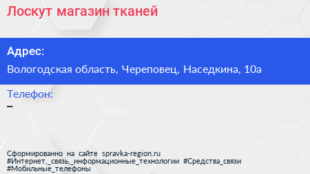 Лоскут, магазин тканей по адресу Вологодская область, Череповец, Наседкина, 10а в дальнейшем Организация, размещена в следующих категориях: