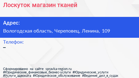 Лоскуток, магазин тканей по адресу Вологодская область, Череповец, Ленина, 109 в дальнейшем Организация, размещена в следующих категориях: