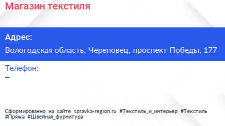 Магазин текстиля по адресу Вологодская область, Череповец, проспект Победы, 177 в дальнейшем Организация, размещена в следующих категориях: