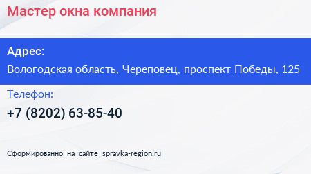Мастер окна, компания по адресу Вологодская область, Череповец, проспект Победы, 125 в дальнейшем Организация, размещена в следующих категориях: