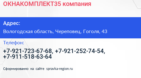ОКНАКОМПЛЕКТ35, компания по адресу Вологодская область, Череповец, Гоголя, 43 в дальнейшем Организация, размещена в следующих категориях: