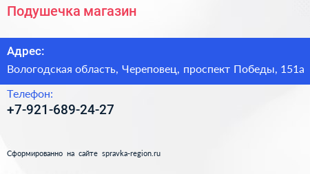 Подушечка, магазин по адресу Вологодская область, Череповец, проспект Победы, 151а в дальнейшем Организация, размещена в следующих категориях: