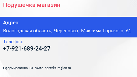 Подушечка, магазин по адресу Вологодская область, Череповец, Максима Горького, 61 в дальнейшем Организация, размещена в следующих категориях: