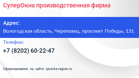 СуперОкна, производственная фирма по адресу Вологодская область, Череповец, проспект Победы, 131 в дальнейшем Организация, размещена в следующих категориях: