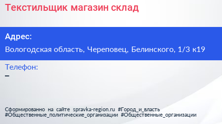 Текстильщик, магазин-склад по адресу Вологодская область, Череповец, Белинского, 1/3 к19 в дальнейшем Организация, размещена в следующих категориях: