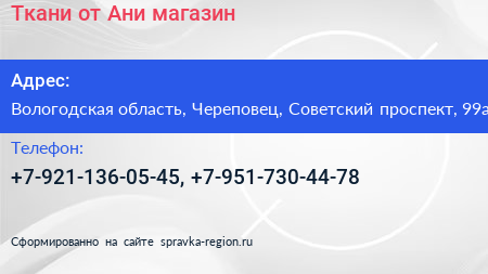 Ткани от Ани, магазин по адресу Вологодская область, Череповец, Советский проспект, 99а в дальнейшем Организация, размещена в следующих категориях: