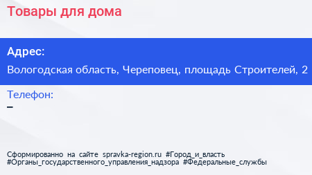Товары для дома по адресу Вологодская область, Череповец, площадь Строителей, 2 в дальнейшем Организация, размещена в следующих категориях: