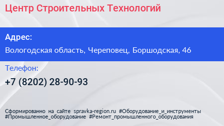 Центр Строительных Технологий+ по адресу Вологодская область, Череповец, Боршодская, 46 в дальнейшем Организация, размещена в следующих категориях: