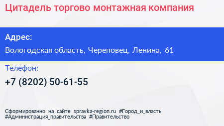 Цитадель, торгово-монтажная компания по адресу Вологодская область, Череповец, Ленина, 61 в дальнейшем Организация, размещена в следующих категориях: