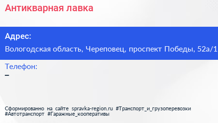 Антикварная лавка по адресу Вологодская область, Череповец, проспект Победы, 52а/1 в дальнейшем Организация, размещена в следующих категориях: