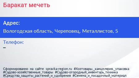 Баракат, мечеть по адресу Вологодская область, Череповец, Металлистов, 5 в дальнейшем Организация, размещена в следующих категориях: