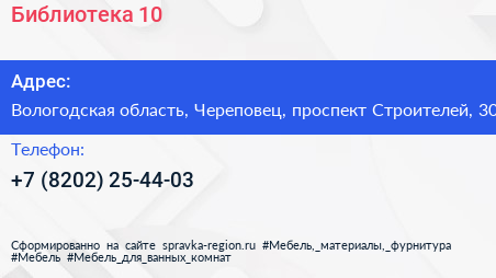 Библиотека №10 по адресу Вологодская область, Череповец, проспект Строителей, 30 в дальнейшем Организация, размещена в следующих категориях: