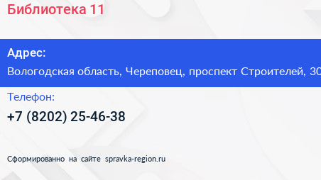 Библиотека №11 по адресу Вологодская область, Череповец, проспект Строителей, 30 в дальнейшем Организация, размещена в следующих категориях: