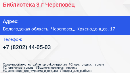 Библиотека №3, г. Череповец по адресу Вологодская область, Череповец, Краснодонцев, 17 в дальнейшем Организация, размещена в следующих категориях: