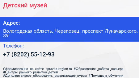 Детский музей по адресу Вологодская область, Череповец, проспект Луначарского, 39 в дальнейшем Организация, размещена в следующих категориях: