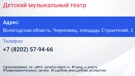 Детский музыкальный театр по адресу Вологодская область, Череповец, площадь Строителей, 1 в дальнейшем Организация, размещена в следующих категориях: