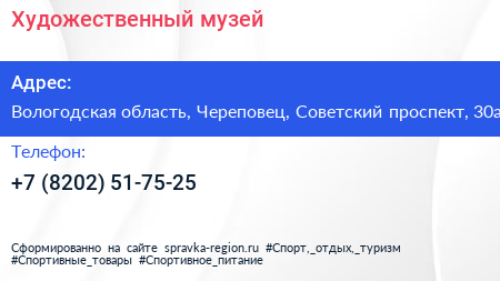 Художественный музей по адресу Вологодская область, Череповец, Советский проспект, 30а в дальнейшем Организация, размещена в следующих категориях: