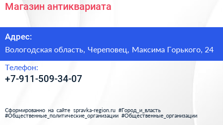Магазин антиквариата по адресу Вологодская область, Череповец, Максима Горького, 24 в дальнейшем Организация, размещена в следующих категориях: